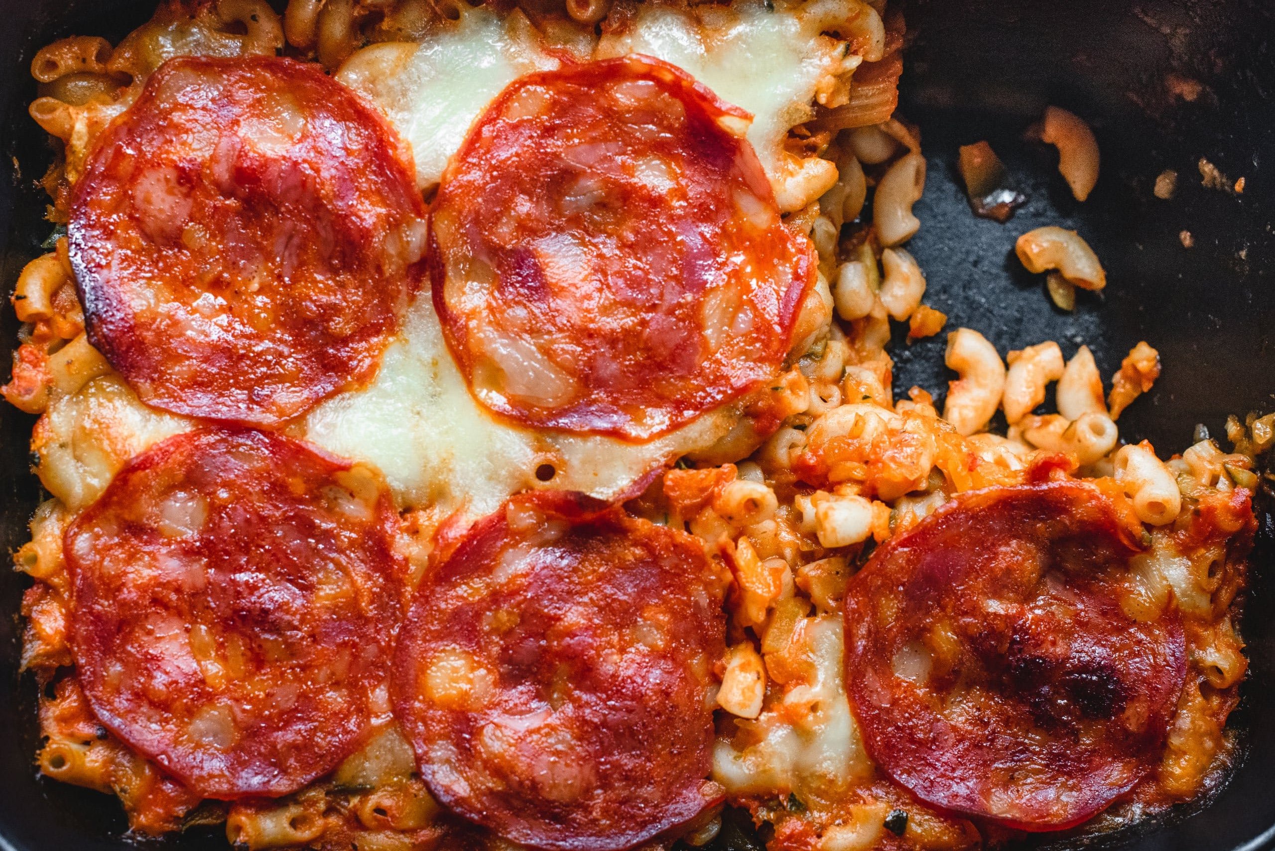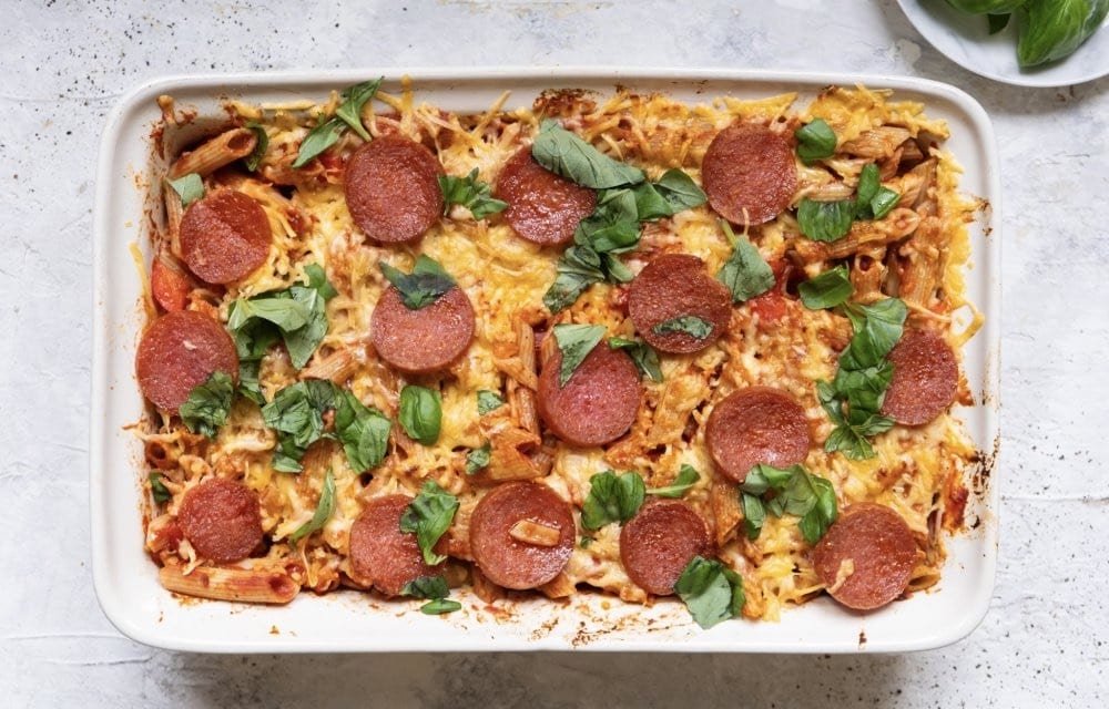 Pizza in een ovenschaal? Yes please! Deze pizza-salami ovenschotel is alles wat je wilt op een drukke dag: cheesy, hartig, snel klaar én met maar 5 ingrediënten. Pasta meets pizza, maar dan zonder gedoe. Hup, de oven in en smullen maar!