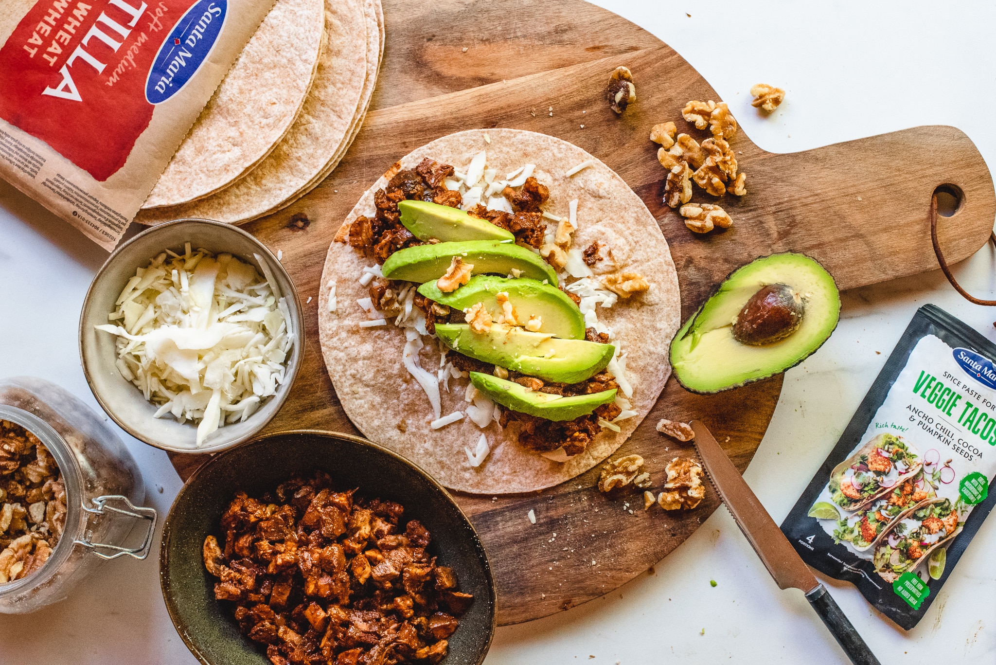 Tot slot een lekker vegan recept. Deze wraps maak je met paddenstoelen, witte kool en Santa Maria veggie taco kruidenpasta.
