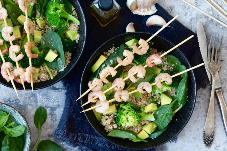 Je hebt slechts 15 minuten nodig om ervoor te zorgen dat deze groene salade met garnalenspiesjes en spinazie, broccoli en avocado straks op je bord ligt. En dit gezonde diner bevat maar 6 ingrediënten. Als dat niet makkelijk is, weten wij het ook niet meer!