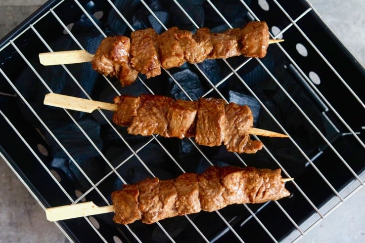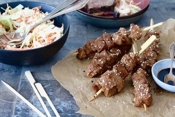 – Rijg de stukjes jodenhaas dan aan de prikkers en bak ze in zo’n 8 minuten rondom gaar op de barbecue.