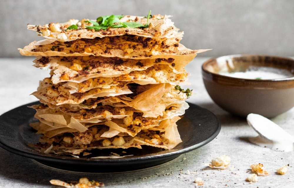 –  Verbrokkel 20 gram van de feta en strooi deze samen met de gedroogde kruiden over het filodeeg. Hak de koriander grof en strooi de helft hiervan ook over het filodeeg.