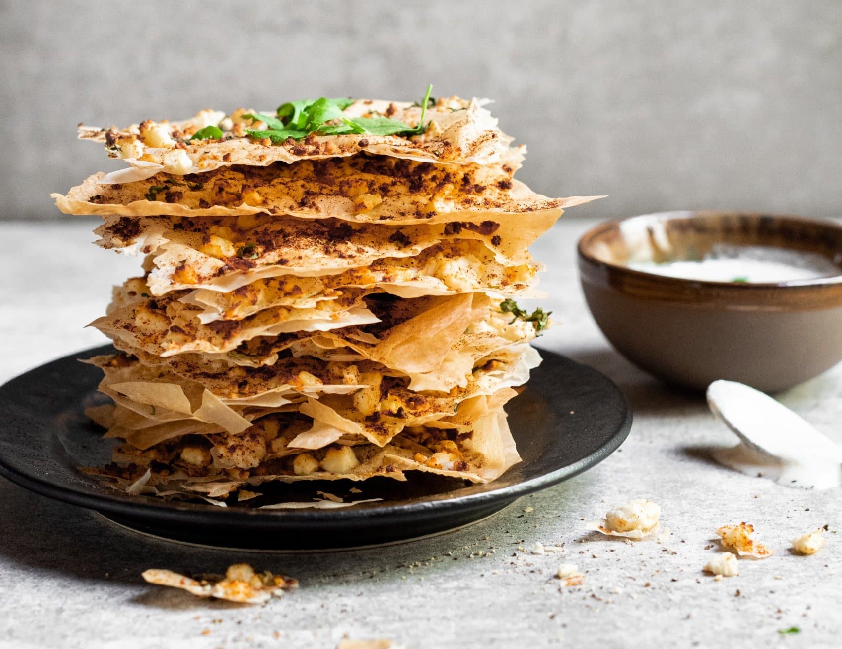 – Schep de fetadip in een kommetje en drizzle hier de honing overheen. Maak af met de overgebleven koriander en serveer met het gebakken filodeeg.