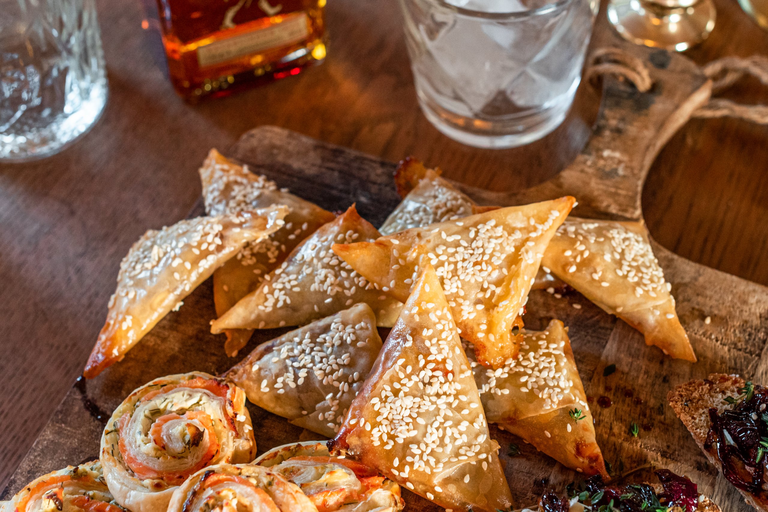 – Verdeel de filodeegdriehoekjes over een met bakpapier beklede bakplaat. Besmeer de bovenkant met een beetje olie en verdeel daar de sesamzaadjes over. Bak 10 minuten in de oven en serveer.