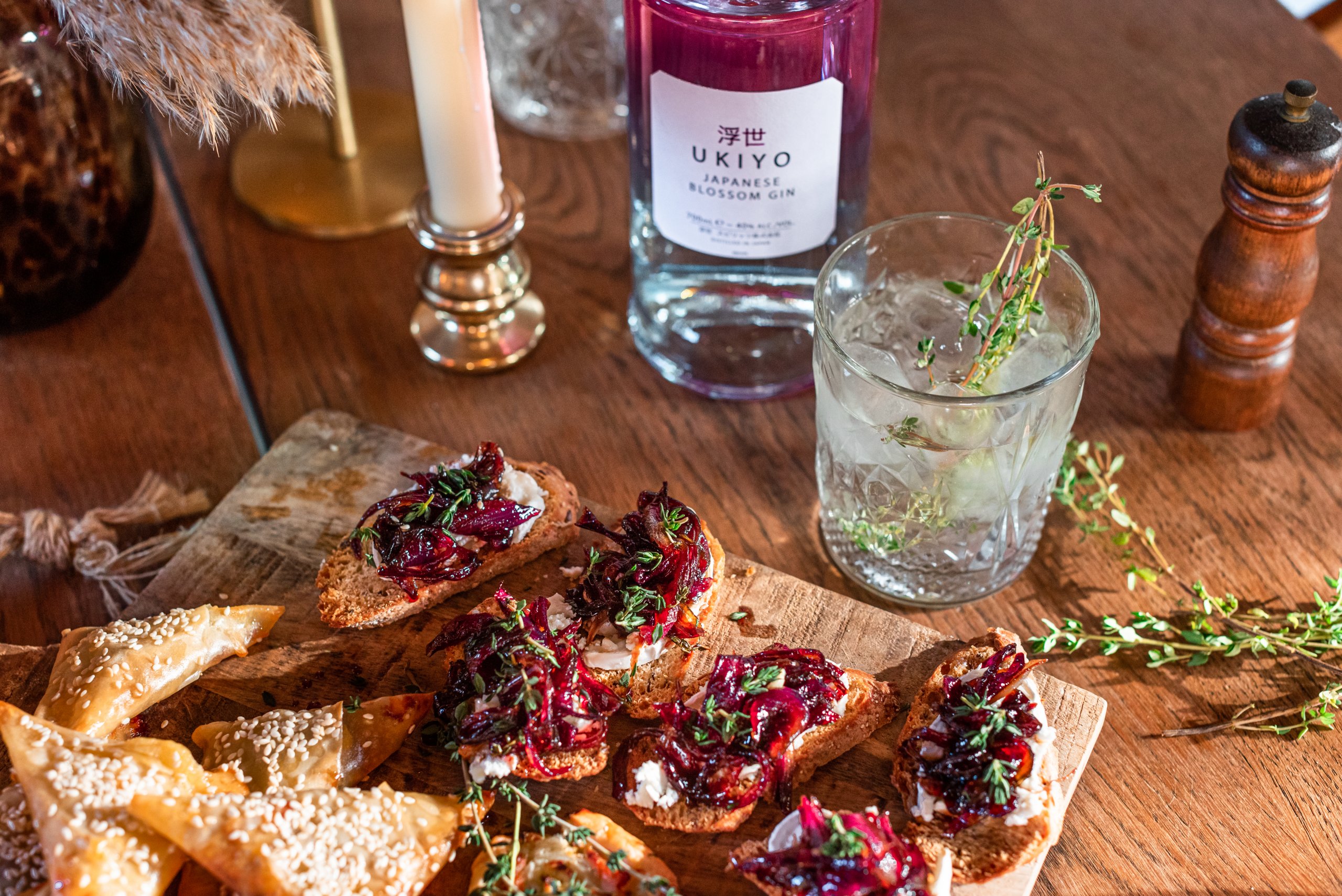 – Verdeel eerst de geitenkaas en daarna de uienchutney over de crostini’s. Maak af met de rest van de tijm.
