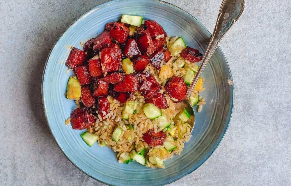 We blijven nog even bij watermeloen, maar dan in een compleet andere vibe. Deze vegan rijstsalade met pittige watermeloen is fris, vullend en heeft net dat beetje kick. Perfect als je een zomerse salade wilt die niet saai is.