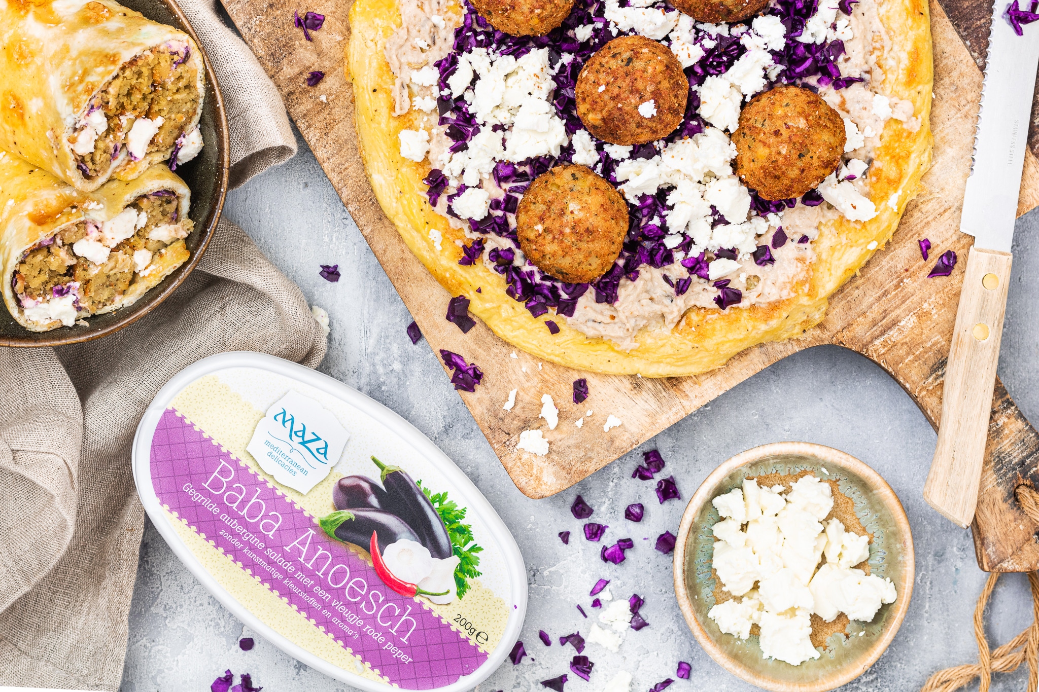 – Smeer de eierwrap in met de Baba Anoesch. Beleg met de falafel en rode kool. Verbrokkel de feta over de wraps en rol ze op.