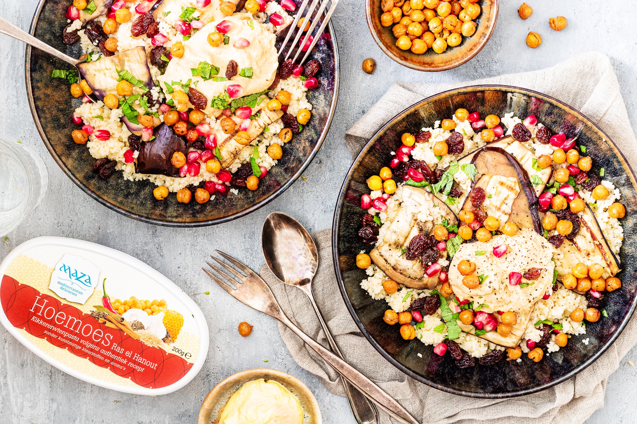 – Neem twee kommen en vul ze met de couscous, gegrilde aubergine, kikkererwten, granaatappeltjes en maak af met de rozijnen en munt.