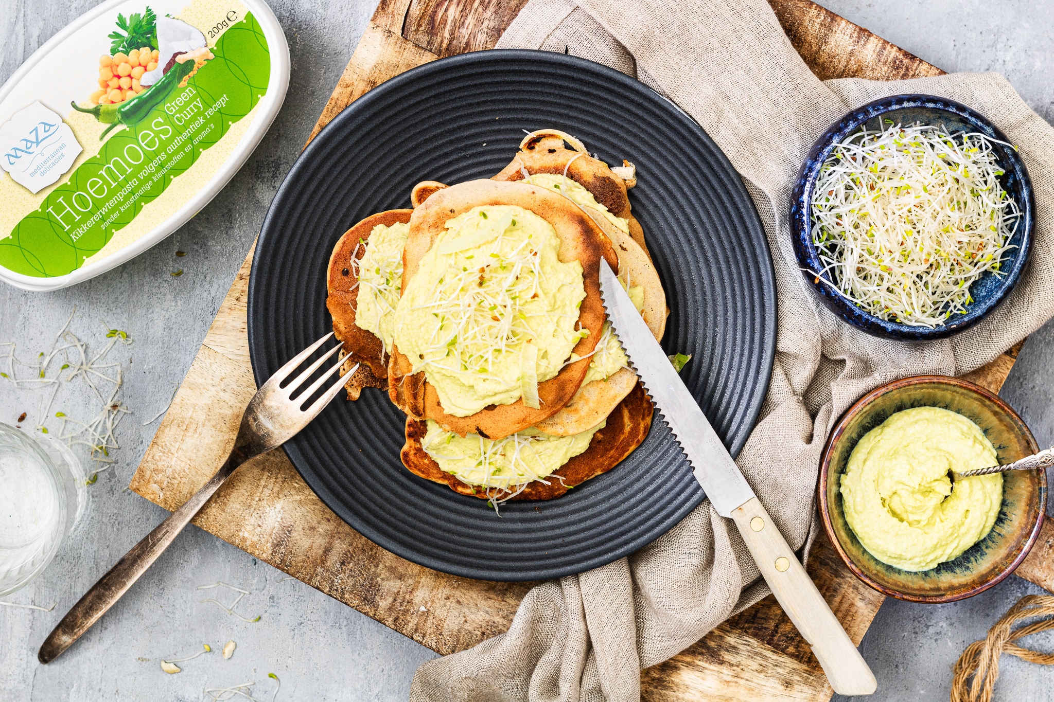 – Besmeer met de Hoemoes Green Curry en verdeel de alfalfa over de vier pannenkoeken.