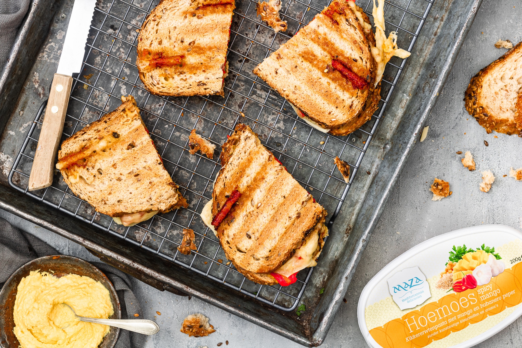 Tosti met Hoemoes Spicy Mango, oude kaas en gegrilde paprika
