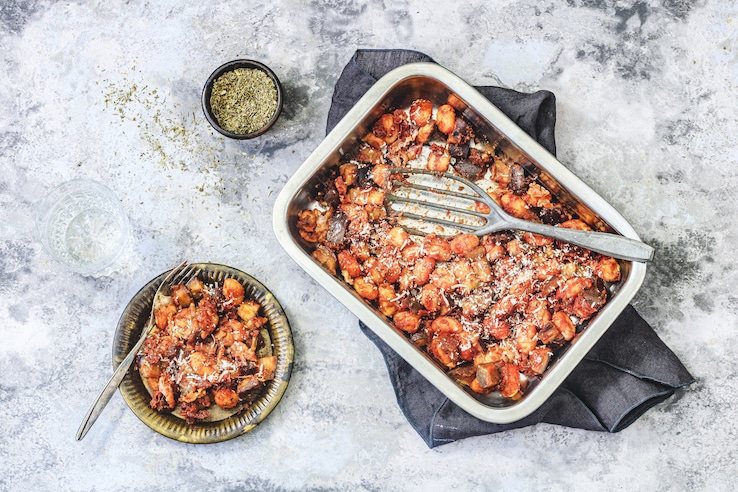– Doe de gnocchi samen met de aubergine in een ovenschaal, besprenkel met wat olijfolie en een flinke snuf peper en zout, en stoom zo’n 20 minuten op 99 graden, medium stoom.