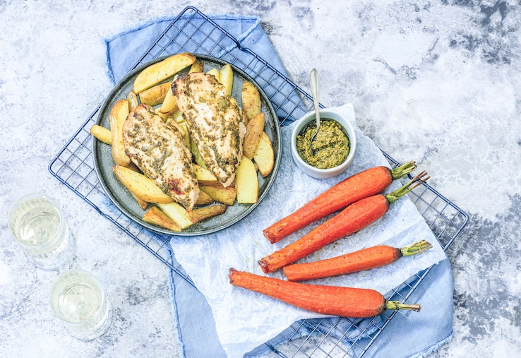 – Leg de kipfilets bij de aardappelpartjes en worteltjes op de bakplaat en schuif voor 20 minuten de stoomoven in.