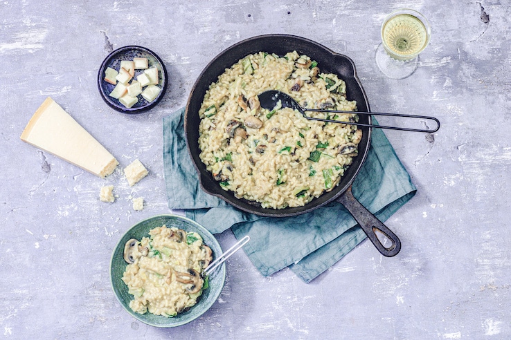 – Roer de bouillon door de pan met risottorijst, courgette en champignons en zet de pan in z’n geheel in de stoomoven.