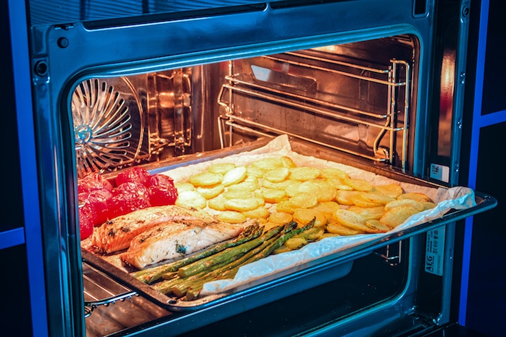 – Haal na 5 minuten de bakplaat uit de stoomoven en leg de zalm bij de aardappelschijfjes op de plaat.