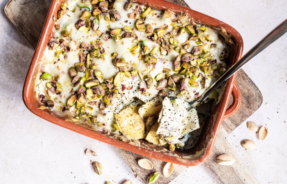 We starten met deze fantastische five or less-topper: een romige raviolischotel met crunchy pistachenoten! Gooi alles in één ovenschaal, zet ‘m 15 minuten in de oven en voilà. Wedden dat je deze vaker gaat maken?