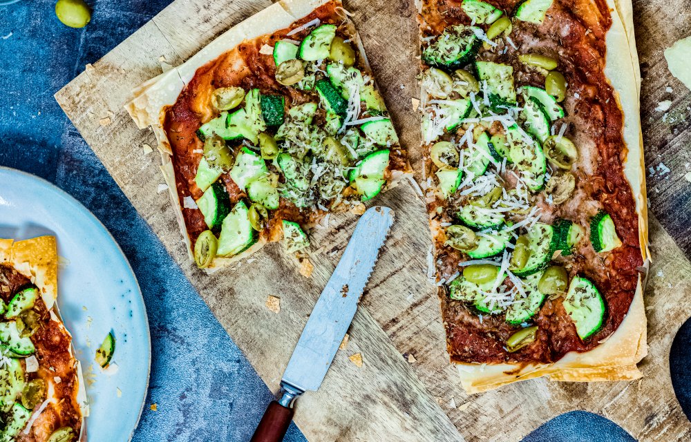 Deze Italiaanse filodeegpizza met courgette, olijven en Parmezaanse kaas heeft een skinny imago én is in een handomdraai gemaakt! Easy does it!