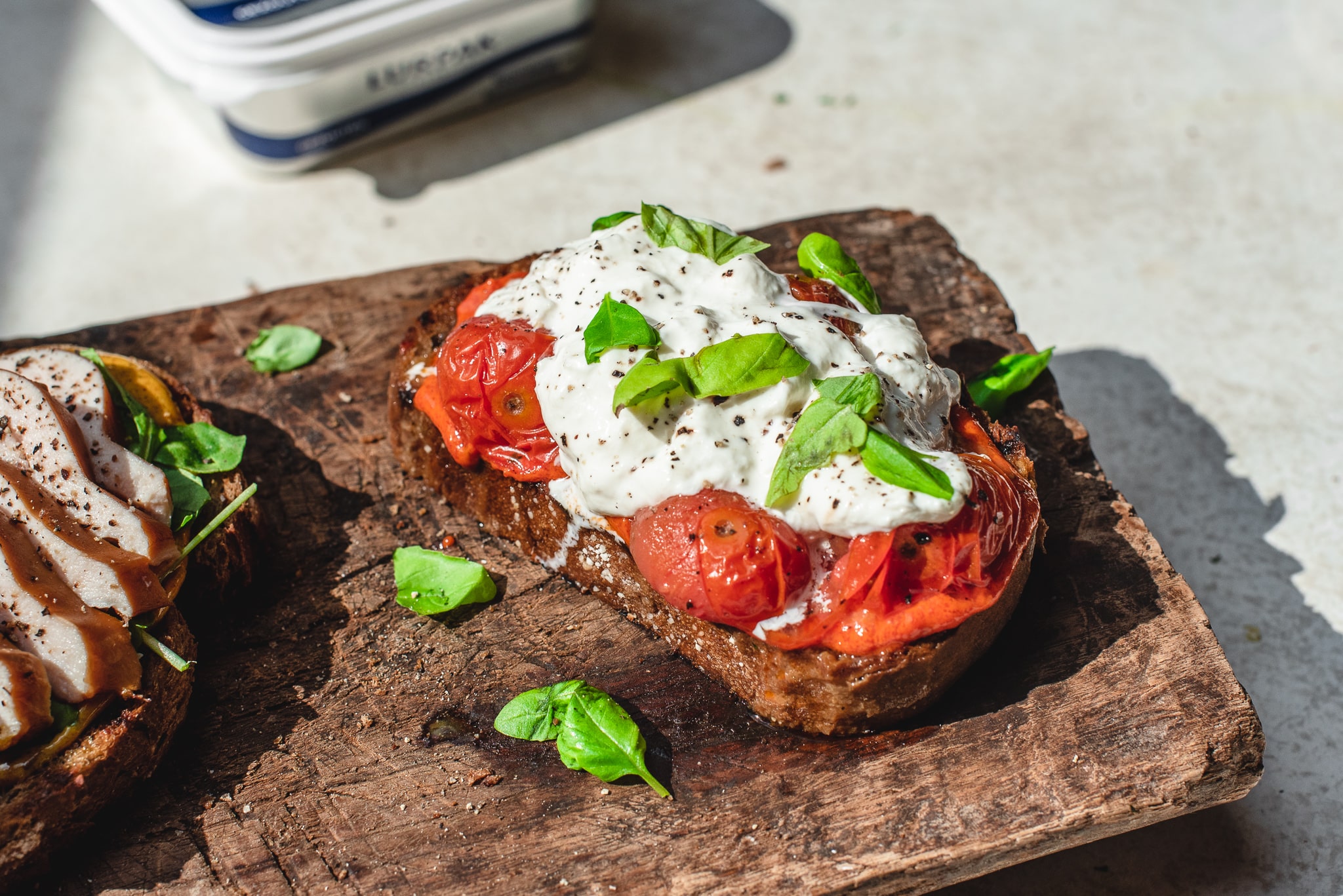 Dit zit er heerlijk uit toch?! Makkelijk en gezond broodbeleg, maar dan next level. Je hebt cherrytomaatjes nodig, knoflook, boter, tomatenpuree, burrata en basilicum. Wij ruilen ons plakje kaas hier met liefde voor in!