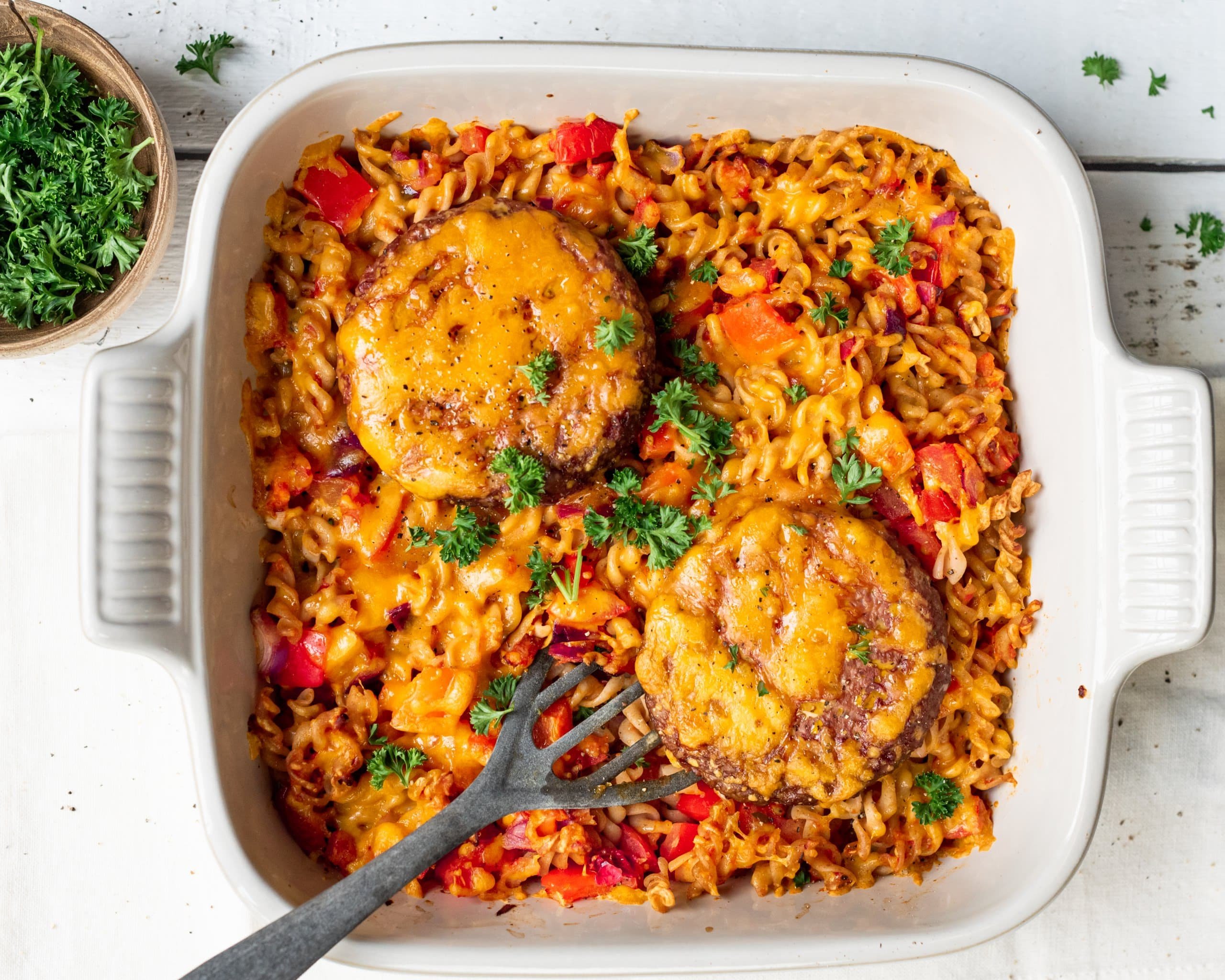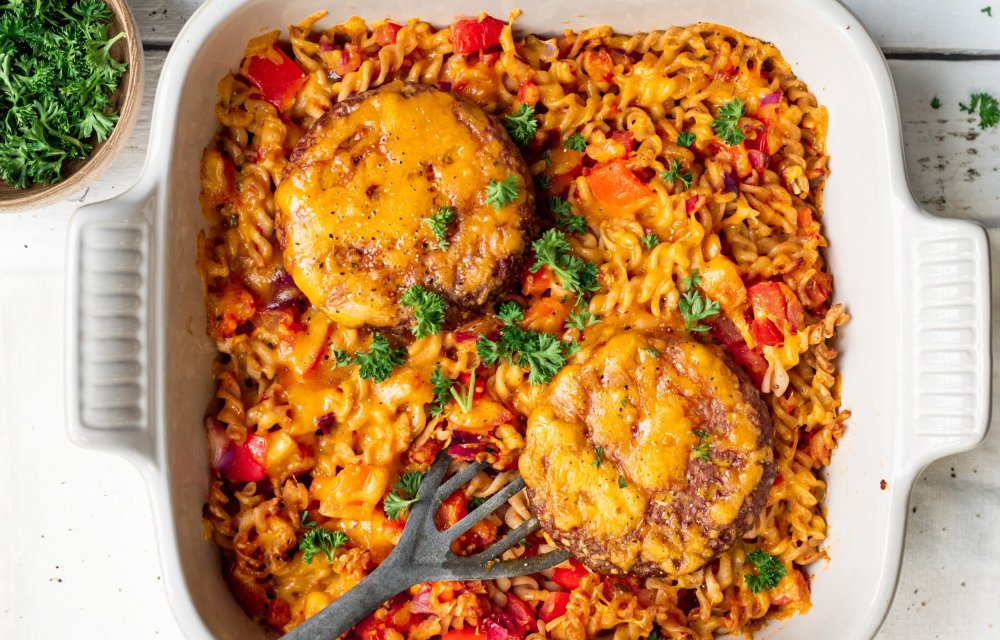 Ohhh, dit is toch echt comfort food ten top?! Romige pasta, sappige burger, gesmolten kaas…en allemaal samengepakt in één schaal. YUM!