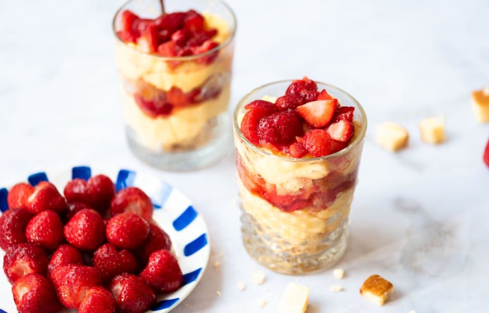 Met slechts vier ingrediënten – aardbeien, plakjes cake, banketbakkersroom en een beetje suiker – tover je in 15 minuten een vrolijk dessert op tafel. Enne, mega fijn: je hoeft de oven niet eens aan te zetten!