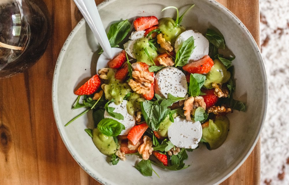 5. AARDBEIENSALADE MET GEITENKAAS EN BASILICUM