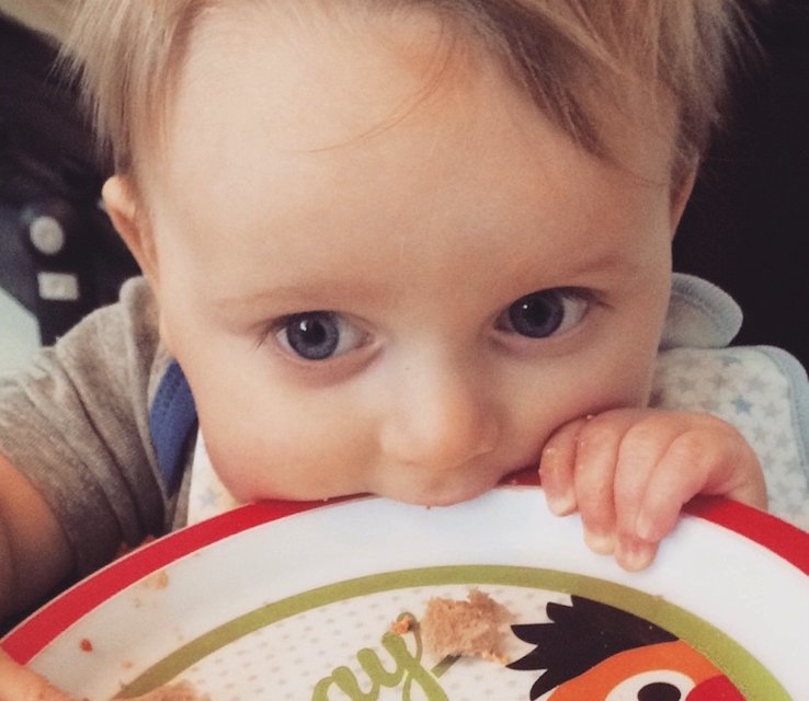 Naast een fles (180 ml) geef ik hem meestal 1 of 1,5 boterham zonder korst, in stukjes. Broodbeleg dat ik hem geef zijn geprakte avocado, sandwichspread of hummus. Helaas mag Mathis geen koemelk, dus smeerkaas of andere kaassoorten zijn nog geen optie.