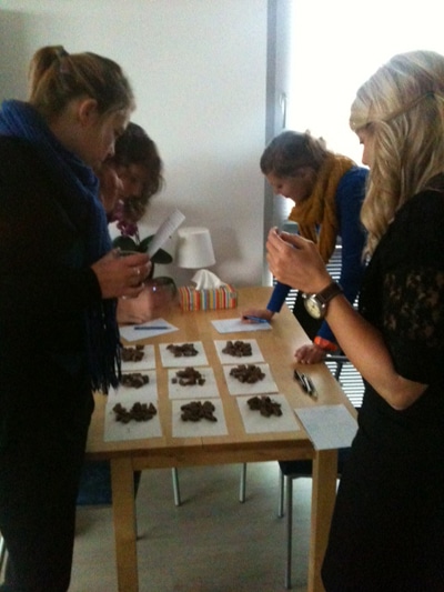 De chocoladeletters zijn in kleine stukjes gehakt en op genummerde velletjes gelegd. Alleen ik wist welk nummer met welk cijfer correspondeerde, mijn vriendinnen niet. Al voordat de test plaatsvindt wordt er druk over gesproken. “Wedden dat ik Droste er zo uitpik?” aldus vriendin Anniek.