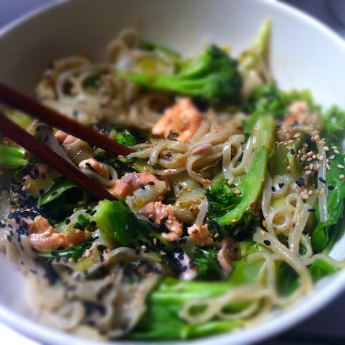 Kook de noodles. Verhit de olie en bak de broccoli een paar minuutjes op hoog vuur. Voeg daarna de zalmblokjes toe en bak het geheel tot de zalm mooi roze is. Schep de noodles door het geheel en besprenkel alles vlak voor het opdienen met de sojasaus en sesamolie. Afmaken met zwart & wit sesamzaad en je hebt een heerlijk gezond en mega makkelijke maaltijd op tafel gezet.