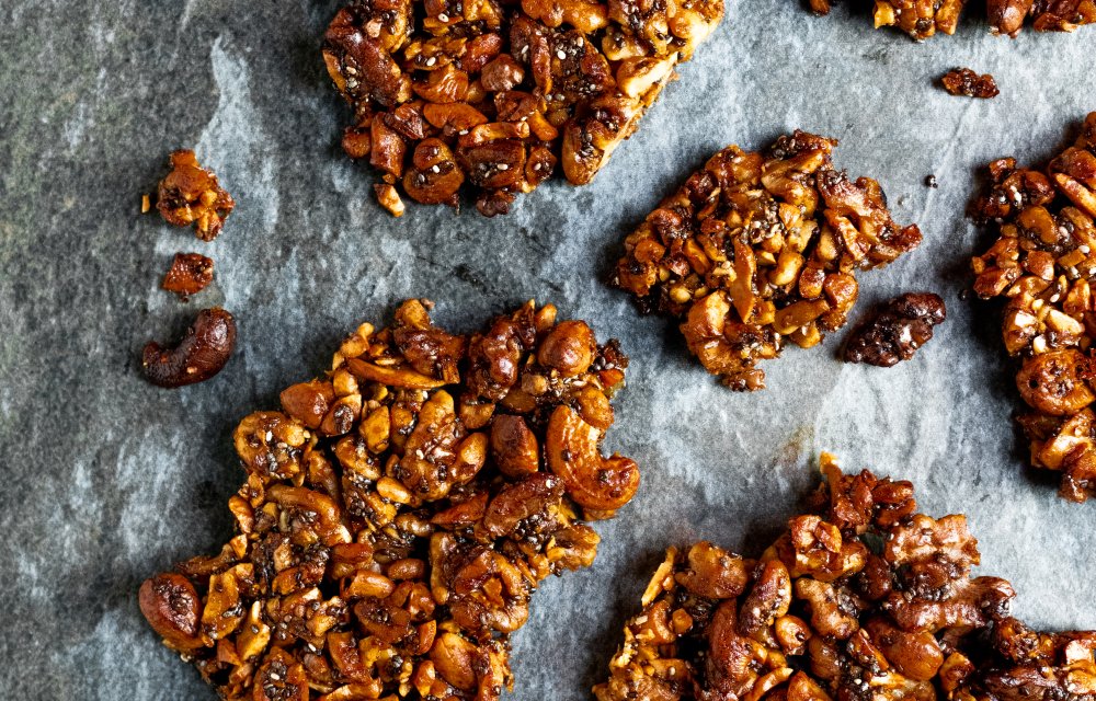 – Haal het bovenste stuk bakpapier eraf en bak het notenmengsel 30-35 minuten in het midden van de oven.