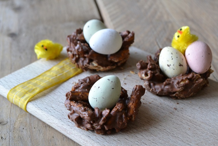 Pien: “Het is weer bijna Pasen en bij Pasen horen 2 dingen: chocolade en eitjes. Op welke manier en in welke vorm dan ook. Hieronder 3 leuke ideeën om met je kids samen te maken en daarna op te peuzelen. Faas (17 maanden) vond de chocoladenestjes niet te versmaden!”