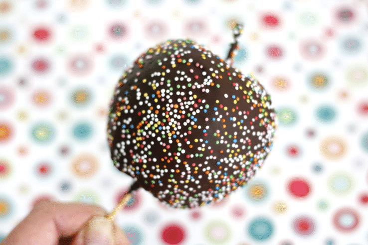 – Haal de appels door de chocolade en vervolgens door de discodip.