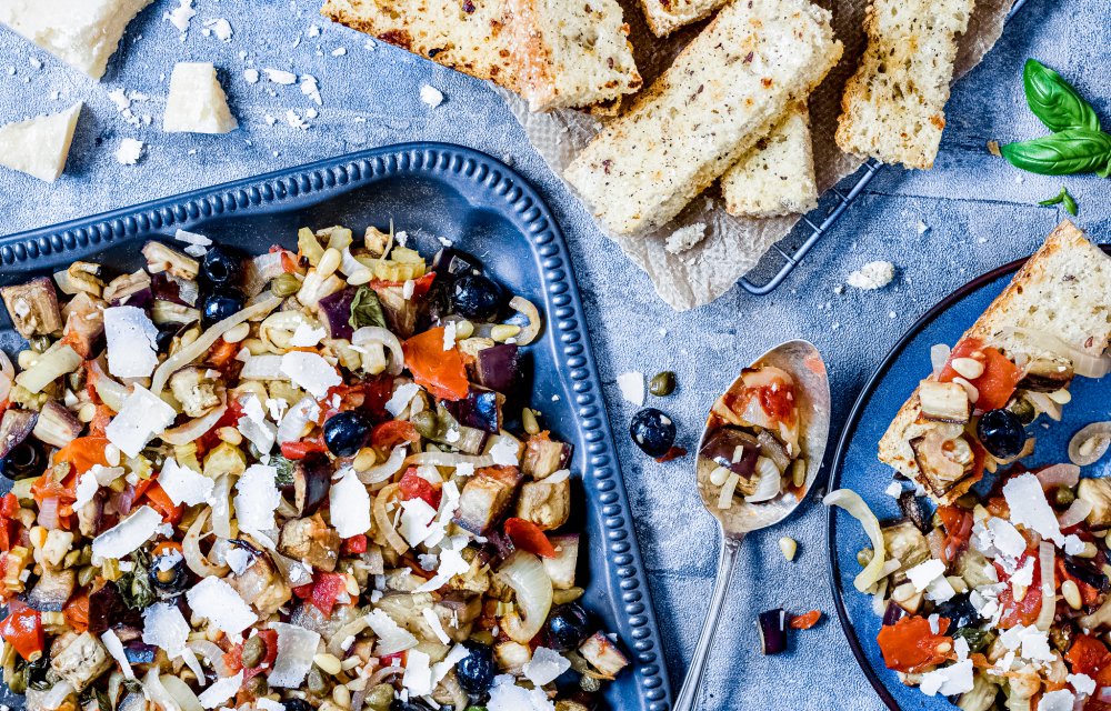 De Siciliaanse bevolking is er gek op: Caponata! Wij lieten ons inspireren door deze klassieker en bereidden hem in de oven. De combi van de verschillende groenten, de zoete dressing met rode wijnazijn en de knapperige croutons is te gek.