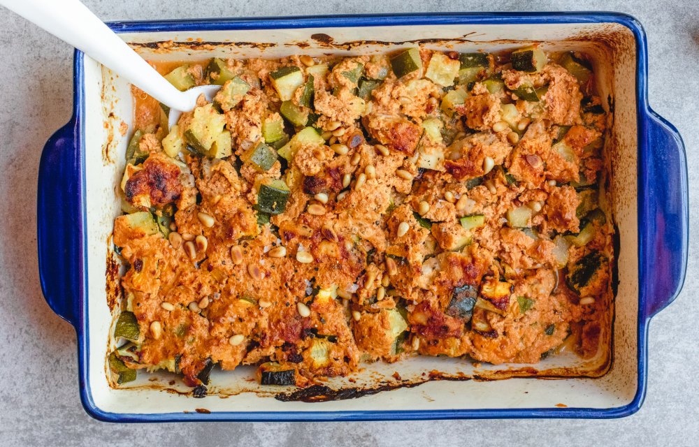 Je hebt er slechts 5 ingrediënten voor nodig en hij staat binnen no time in de oven, deze makkelijke en gezonde ovenschotel! Je maakt ‘m met courgette, kippendij, pijnboompitten, cottage cheese en zongedroogde tomaat!
