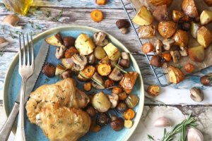 Zin in een lekkere en makkelijke maaltijd waarbij de oven bijna al het werk doet? Dan is dit recept met kipdijfilet, aardappeltjes, kastanje champignons en wortels uit de oven iets voor jou.