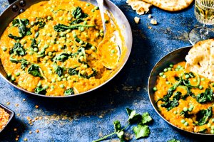 Deze Indiase topper is gemaakt met rode linzen, spinazie en doperwten. Door de kurkuma, komijn, masala en het chilipoeder is dit gerecht lekker kruidig.