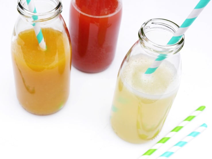 – Verwijder het kaneelstokje en mix het overige fruit samen met 450 milliliter water tot een glad sapje.