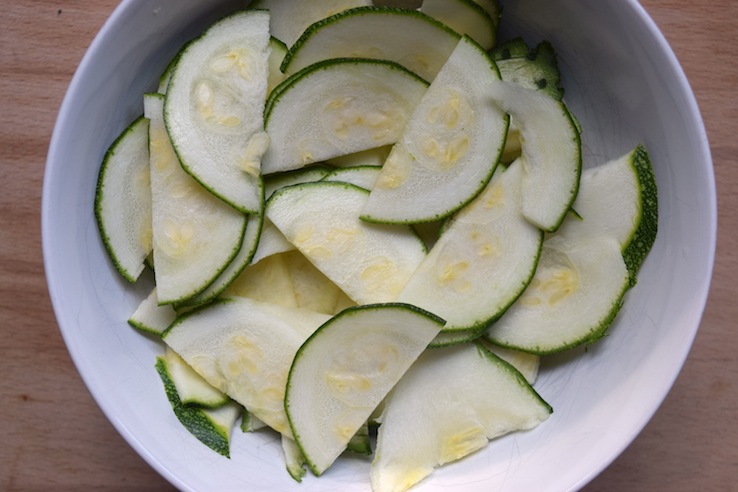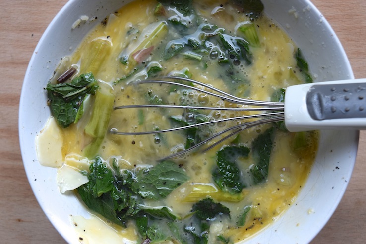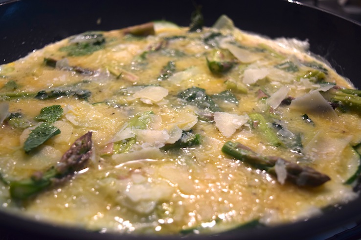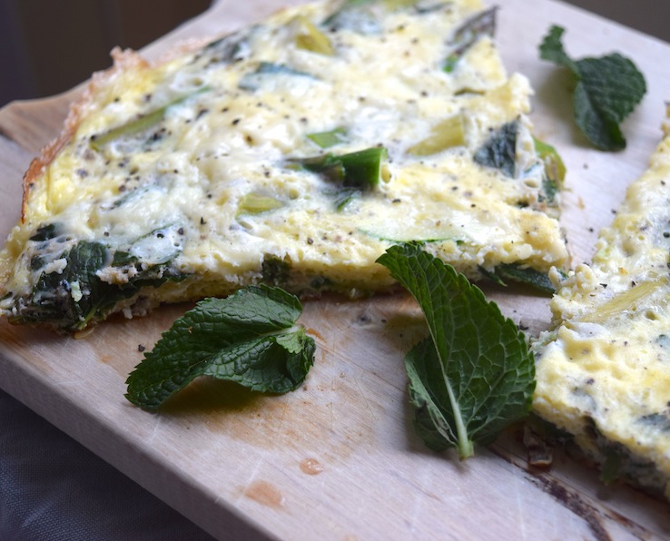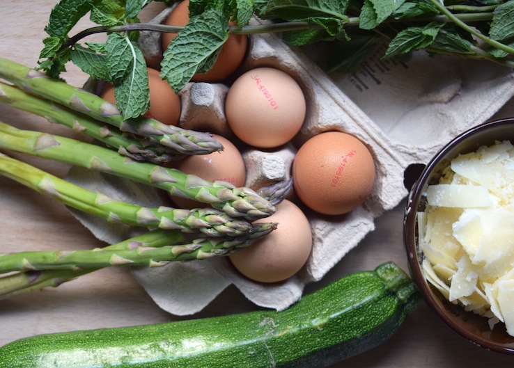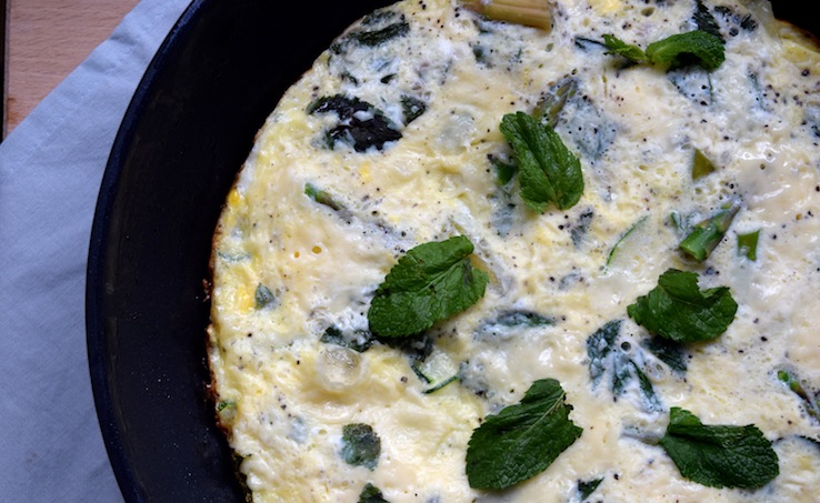 Eigenlijk is een frittata gewoon een hele dikke omelet, waar je alles in kunt doen waar je zin in hebt. Ook aardappel bijvoorbeeld, dan heet het een tortilla. En de combi courgette, aspergetips en munt is verrukkelijk. Ik zit in een periode munt-in-m’n -eten de laatste tijd. Smaakt lekker fris, mag best zo op de àllerlaatste dagen van de zomer (nou ja, herfst… maar dat wil ik nog niet toegeven). En nee, het is geen aspergetijd meer, maar de groene aspergetips kun je het hele jaar door bij de supermarkt krijgen. Niet echt verantwoord, lekker ingevlogen vanuit Peru, maar ik ben er dol op, omdat ze zo crunchy zijn. Ik had ditmaal trouwens het geluk nog een bosje groene asperges op de markt te scoren.