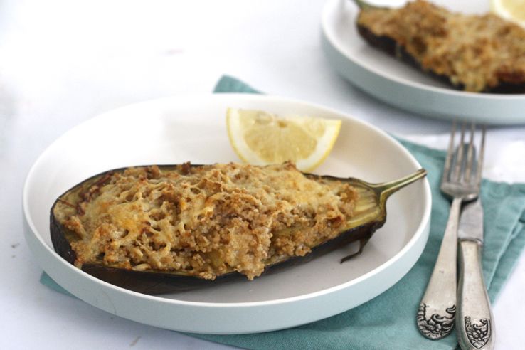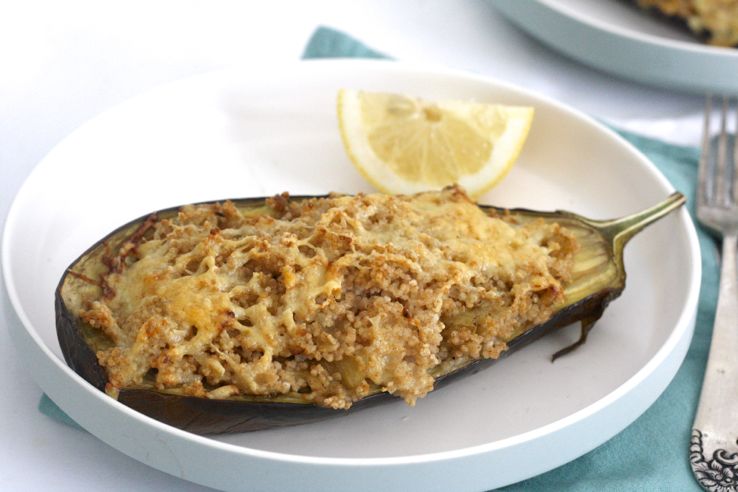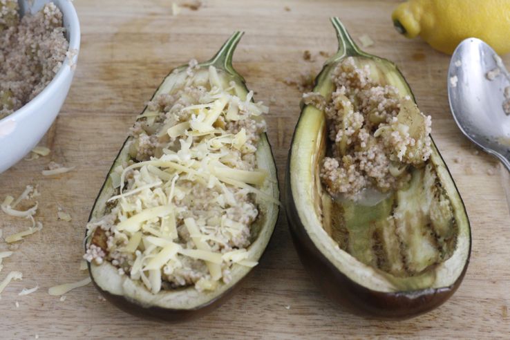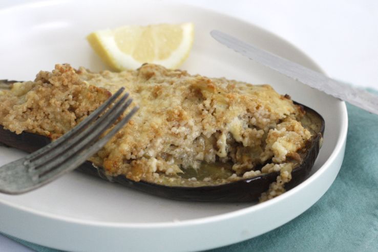Een simpel receptje voor gevulde aubergine met couscous, kaas en citroen. Een heerlijk, verrassende combi. Maken dus! De hoeveelheden zijn voor 2 halve gevulde aubergines. Da’s voor de lunch met z’n tweetjes genoeg. Als je het
