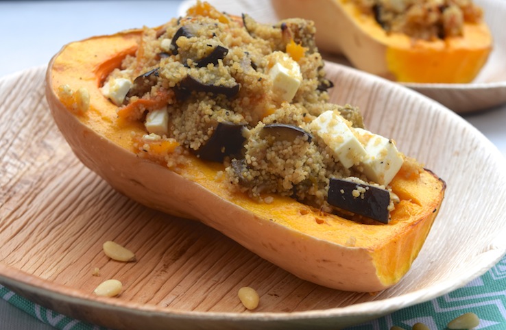 Daar is -ie weer, onze grote oranje vriend. Ik vind het altijd best een gedoe om ‘m uit te hollen of fatsoenlijk te snijden, maar als ik het dan gedaan heb ben ik weer helemaal in m’n element. Ik vind zachte pompoen uit de oven namelijk heerlijk. Al helemaal als je ‘m vult met couscous, feta, aubergine en crunchy pijnboompitjes.