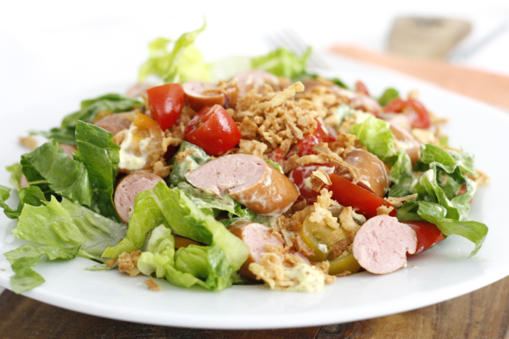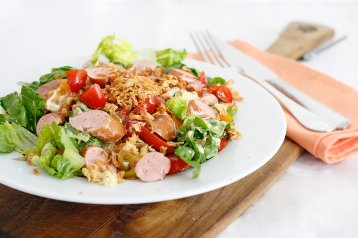 Eerder op Chickslovefood heb ik al een recept voor een hamburgersalade gedeeld. Ideaal voor als je zin hebt in een volgeladen burger, maar niet bomvol wil zitten. Je doet de ingrediënten gewoon allemaal in een salade en klaar. Vandaag een variant met jawel: hotdogs. Ik ben er sinds de foodtruckfestivallen echt gék op!