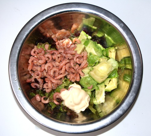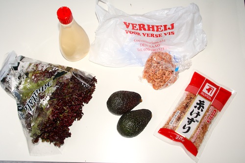 Deze salade is normaal gesproken met rauwe tonijn, maar ik heb er een Hollands tintje aan gegeven door Hollandse garnalen te gebruiken. De salade is romig door de Japanse mayonaise (wat zo zalig is) en een beetje zoutig door de Bonito-vlokken. Het is een machtige salade, dus prima als diner.