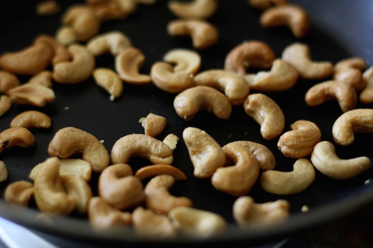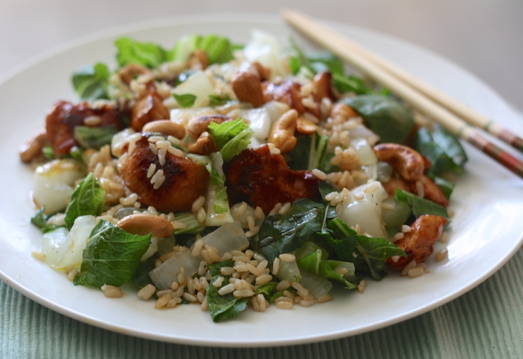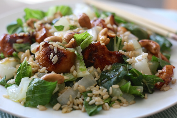 Een gezonde maaltijdsalade, met rauwe groene paksoi, gewokte witte paksoi, cashewnoten en teriyaki-kip. Komt -ie!