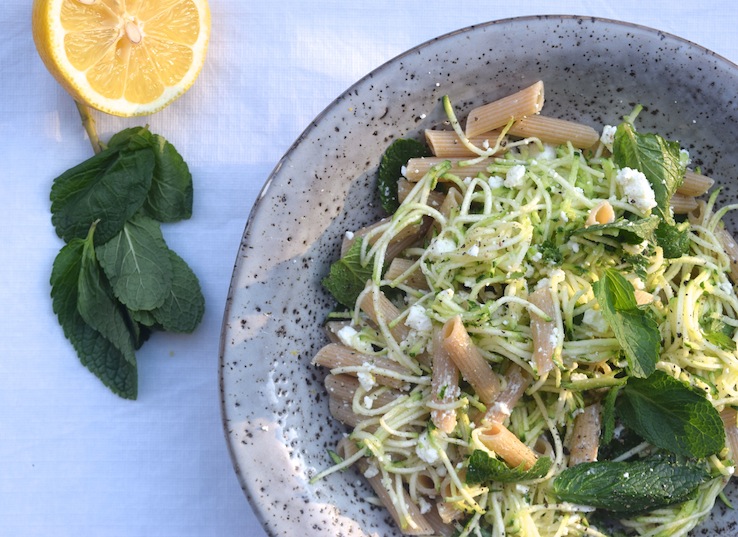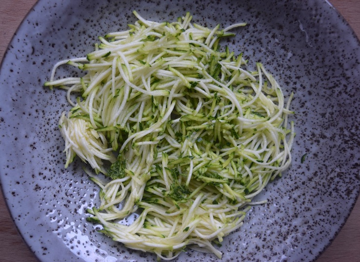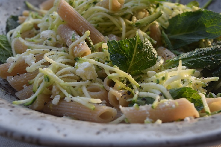 In een kookboek zag ik eens een spaghetti staan die deels uit ‘gewone’ spaghetti bestond en deels uit spaghetti gemaakt van courgette. Maar die courgettesliertjes waren verder niet gekookt of gebakken, helemaal rauw dus. Zou dat lekker zijn? Ik bak courgette altijd. Dus ik nam de proef op de som met een geraspte, rauwe courgette door mijn penne. En mijn oordeel: YUM!