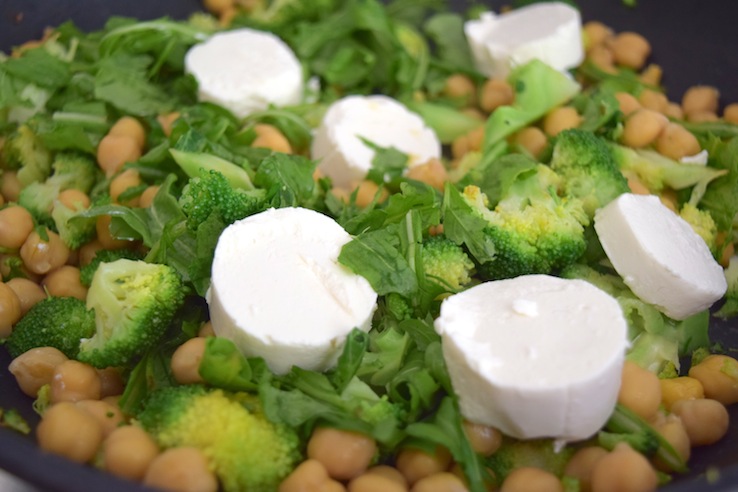 Ja hoor, daar is -ie weer: de zachte geitenkaas. I love love love geitenkaas. Elise haat het, haha. Maar die heeft weer andere dingen die ze meerdere malen per week eet. Anyway, geitenkaas dus. Lekker romig. En dat in combinatie met broccoli, pittige rucola en zachte kikkererwten… Mmmm!