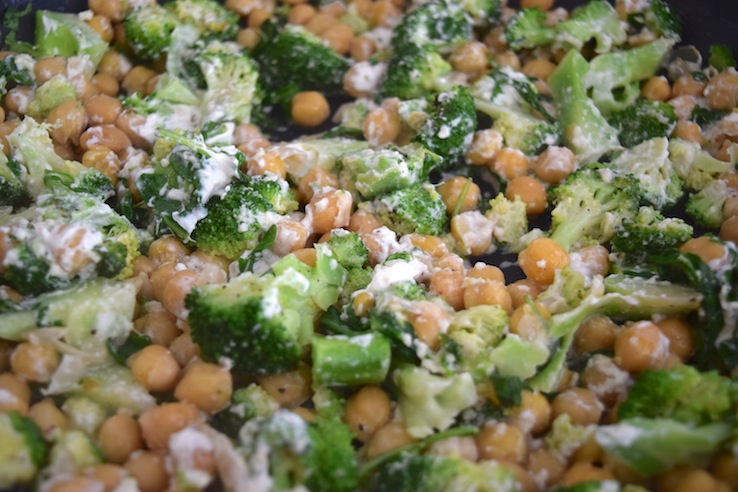 – Doe de kikkererwten bij de broccoli en bak 2 minuten mee.
