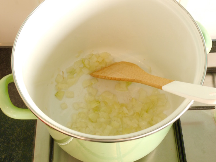 – Verwarm een flinke eetlepel kokosolie in een soeppan en fruit de uitjes op laag vuur aan.