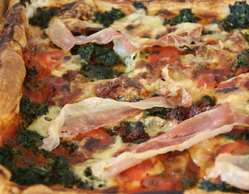 Een snelle platte, hartige taart met spinazie, kaas en Serranoham. Serveer ‘m op een houten plank en je hebt geen eens borden nodig!