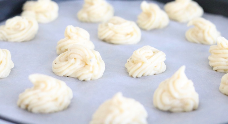 Misschien ken je wel van die perfecte aardappeldrolletjes (ja, drolletjes, zo noemden wij die vroeger), Pommes Duchesse. Ik ben er dol op. En dan heb ik het over zo’n zak uit de vriezer, whaha. Dit recept lijkt daarop. Ze zijn wat minder groot en wat minder gekarteld, maar wél lekkerder dan wanneer je ze uit de vriezer haalt. En all you need is aardappelen en een spuitzak, zo’n beetje. Ik heb nu trouwens een fijn kartelmondje gebruikt, je kunt ook een grote nemen.