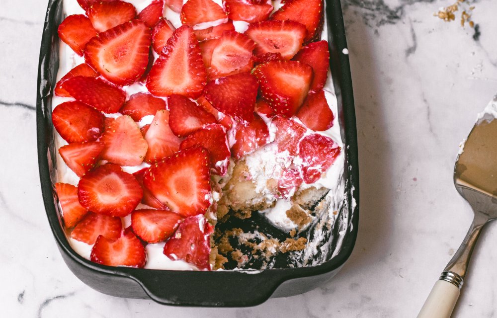 We gooien de klassieke tiramisu om en maken ’m lekker zonnig met verse aardbeien. Geen gedoe met eieren of ingewikkelde lagen. Gewoon 6 simpele ingrediënten, één kom en een kleine ovenschaal. That’s it! Je maakt ‘m zo: lange vingers dopen in koffie, laagje fruit, laagje mascarponeroom, repeat. En hup, in de koelkast. Klaar ben je. Extra leuk: je kunt ze makkelijk een dag van tevoren maken. Scheelt weer stress op het laatste moment.