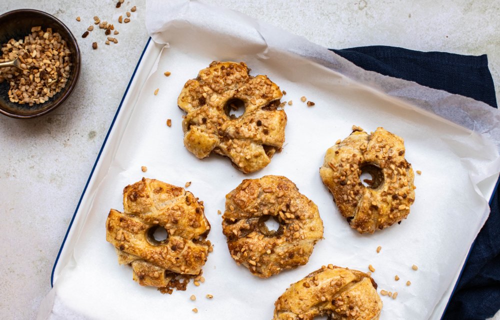 Hoe je deze appeldonuts maakt? Het enige wat je hoeft te doen, is een appel in ringen te snijden. Deze ringen dip je vervolgens in kaneelsuiker en wikkel je in met bladerdeeg. On top nog wat kaneelsuiker en nougatine en dan de oven in! Even wachten ennnn.. je appeldonuts zijn klaar. Klinkt goed, niet?!