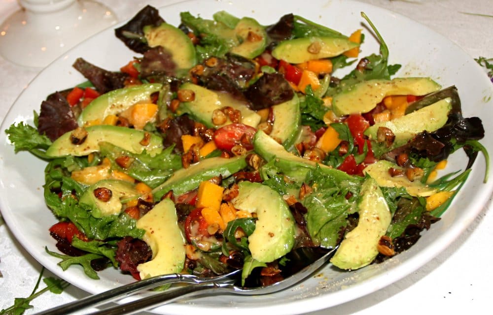 Avocado-mango salade met gekarameliseerde hazelnoten