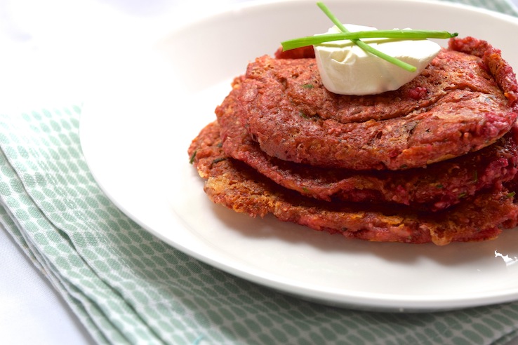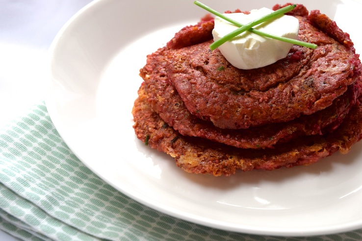 Ik maak best vaak een stapeltje voor mezelf voor de lunch (ik werk veel thuis natuurlijk, dan kan dit) en dit is weer zo’n lunchrecept. Je kunt de pannenkoekjes natuurlijk ook gewoon koud mee naar je werk nemen. Mix gekookte bietjes door je haver-pannenkoekmengsel, wat bieslook, geitenkaas… Mmmm, heerlijke en gezonde pannenkoekjes. En ook fijn: je hebt automatisch weer wat groenten binnen!